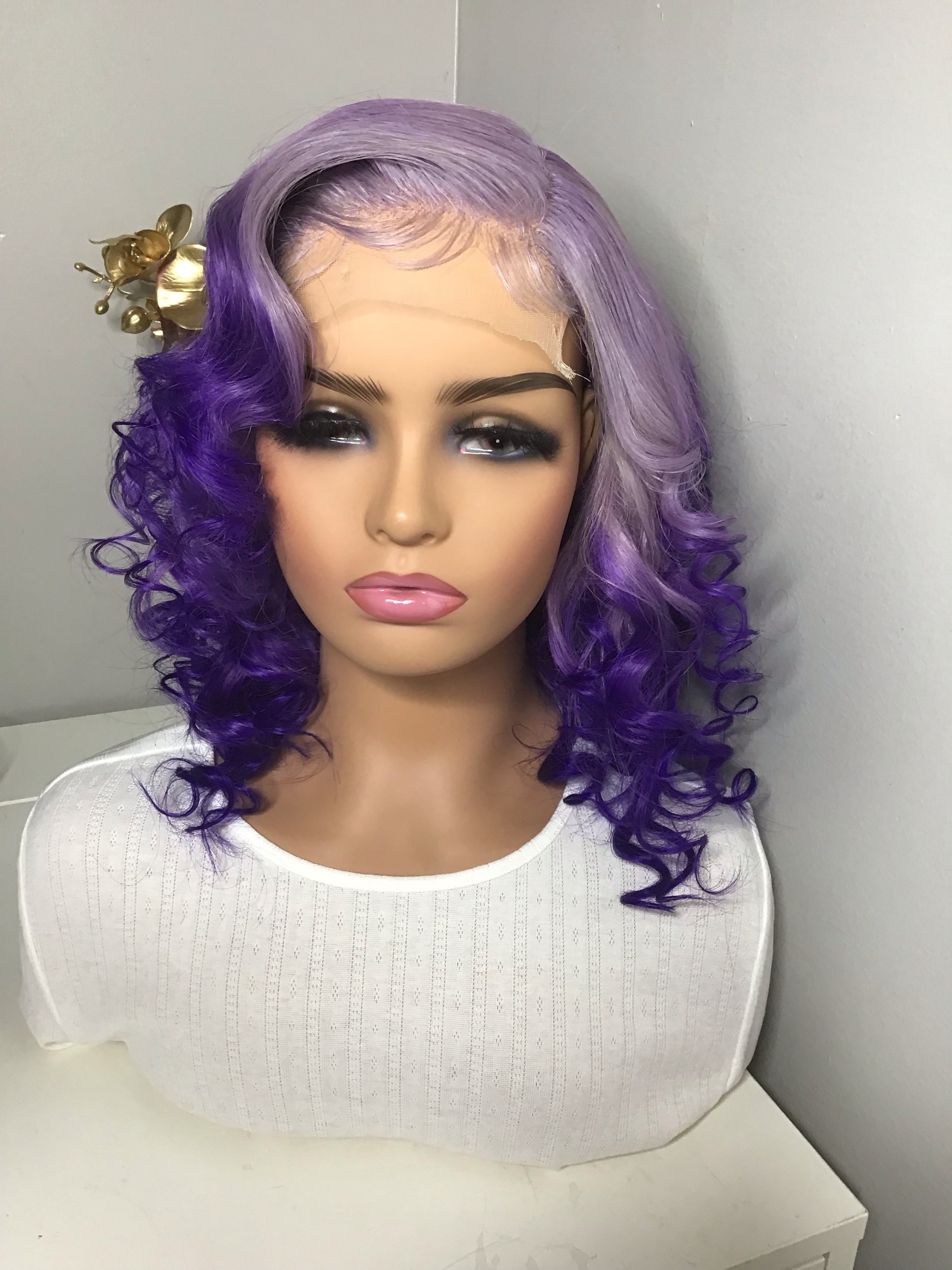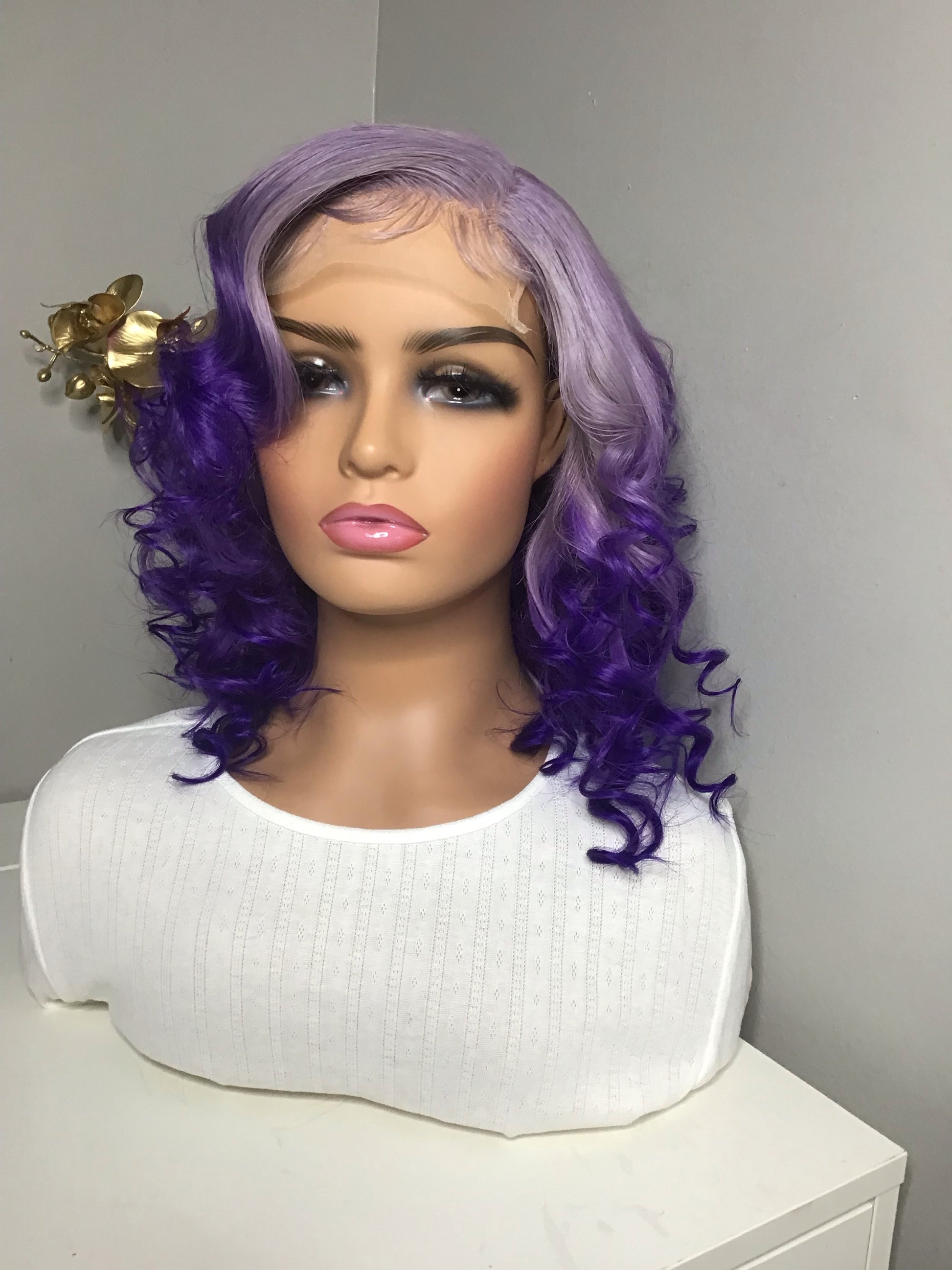 custom ombré purple passion, elastic band, plucked, wand curled 100% glueless